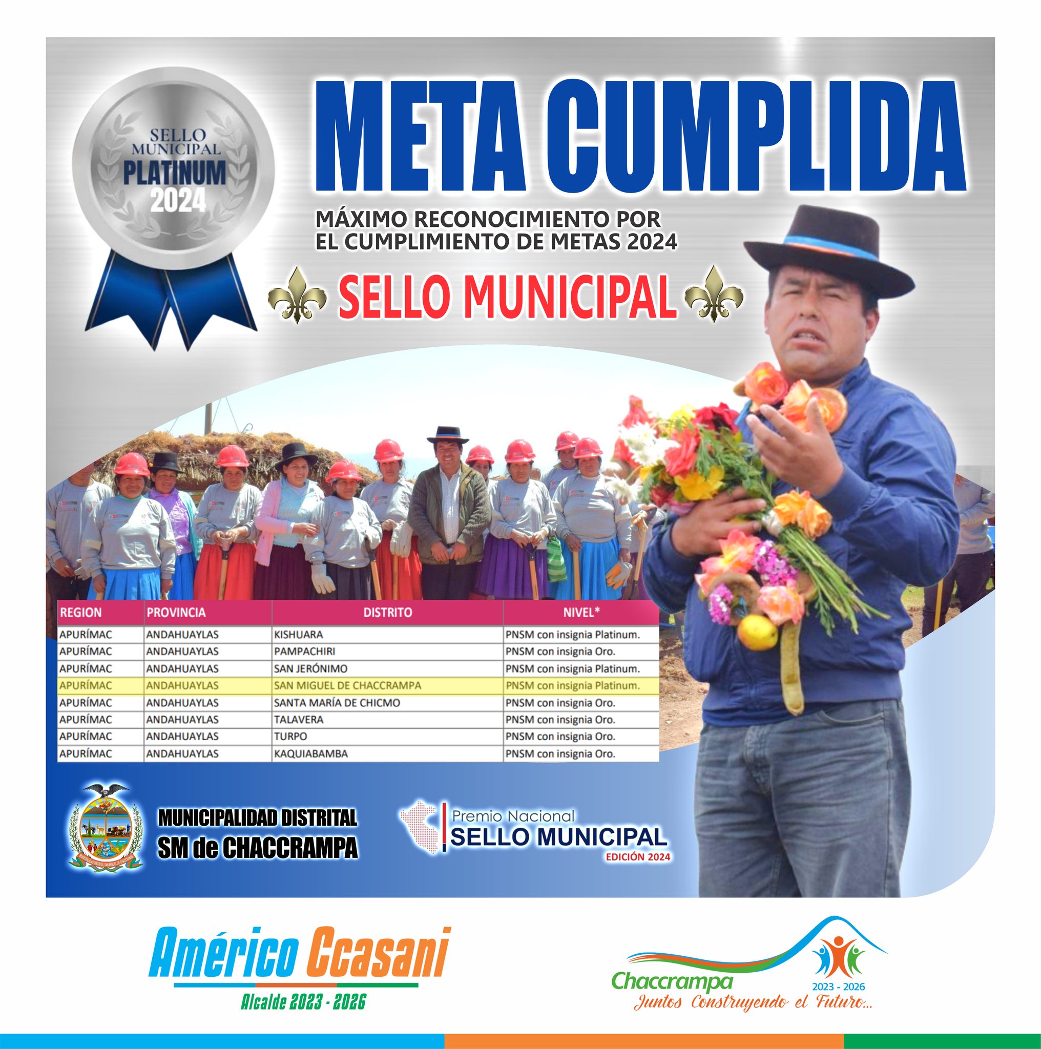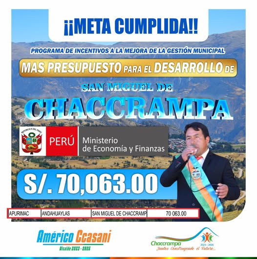 San Miguel de ChacProf. Américo Ccasani Palacios y respaldado por su equipo de trabajo ha cumplido con las metas establecidas en el Tramo I y II del Programa de Incentivos a la Mejora de la Gestión Municipal del Ministerio de Economía y Finanzas, perteneciente al año fiscal 2024, asegurando un financiamiento de S/ 70,063.00. Un logro que refleja el comp